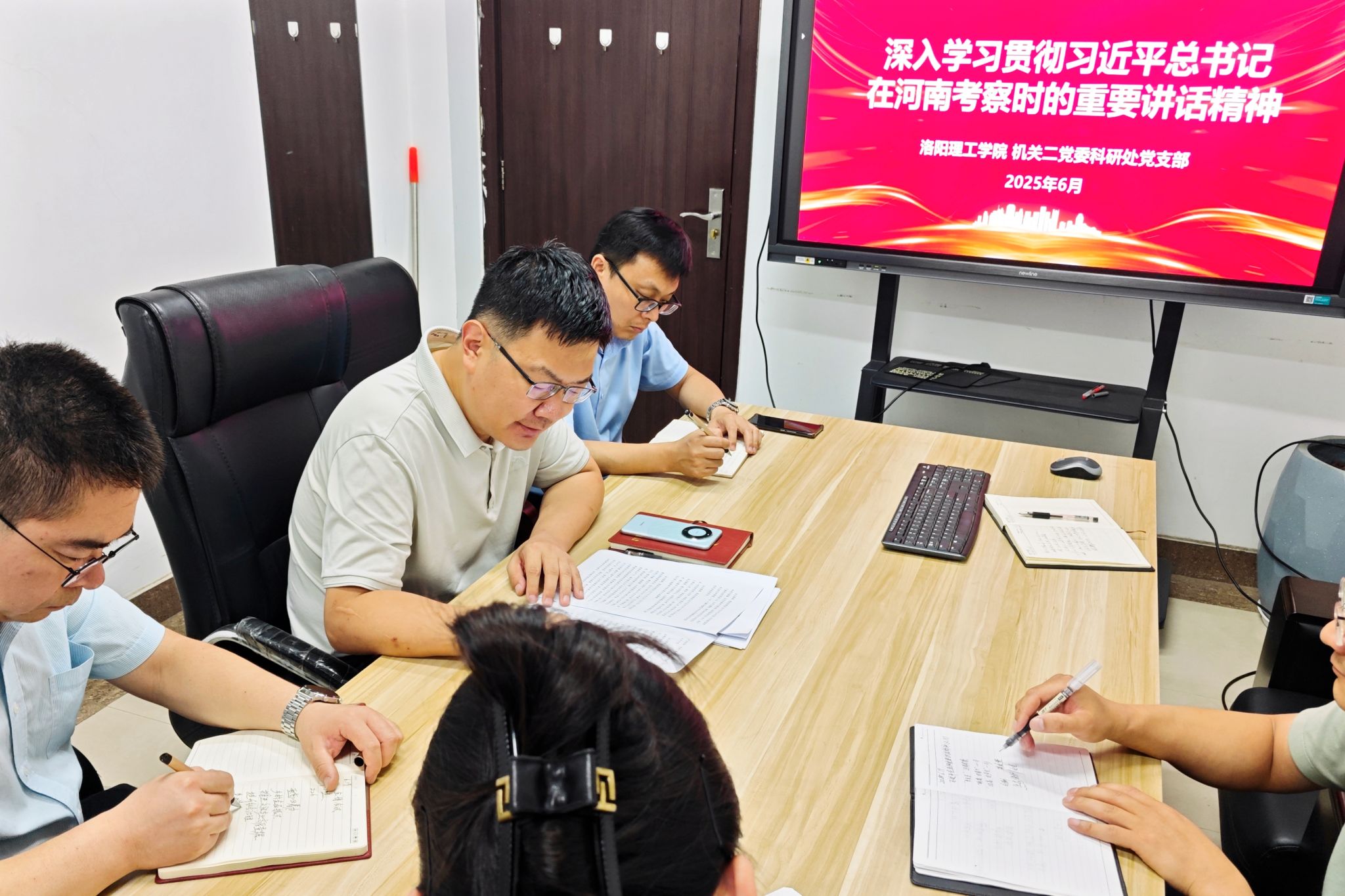 6月19日,科研处党支部召开专题学习会议,集体深入学习贯彻习近平总书记在河南考察时的重要讲话精神。会议由支部书记武超主持,支部全体党员参加。