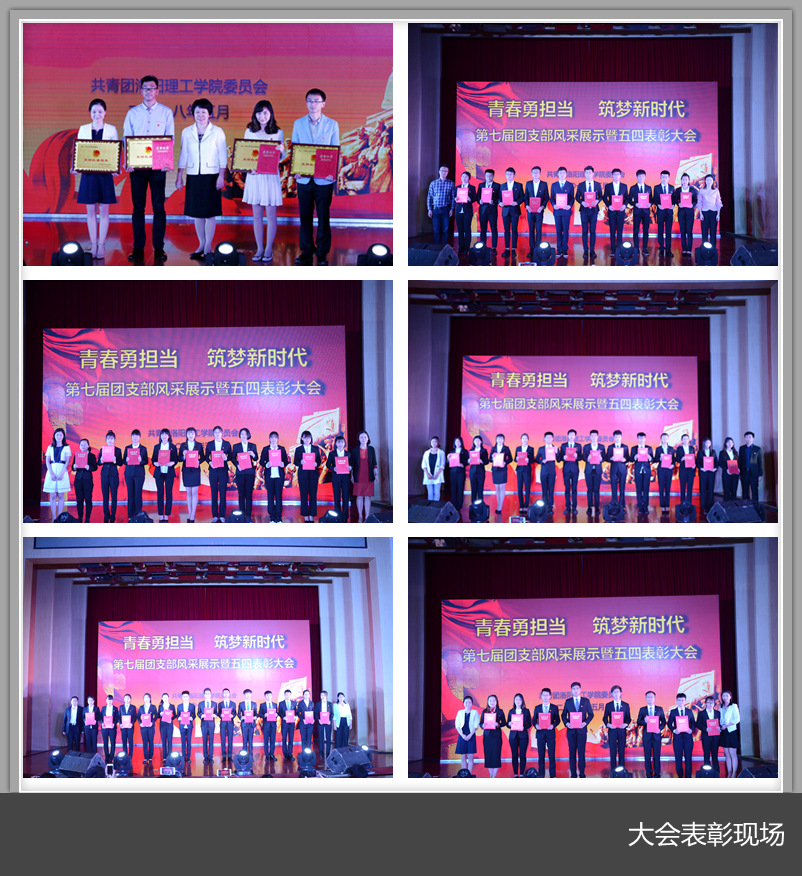 大会对一年来我校共青团工作中涌现的先进集体、优秀个人以及首届最美大学生进行了表彰。共表彰“优秀团员”569名,“模范团干部”399名,“十佳团支部、十佳社团会长、十佳团支书”各10名,“最美大学生”10名以及“五四红旗团支部”55个。材料科学与工程学院团委、环境工程与化学学院团委、计算机与信息工程学院团委、经济与管理学院团委获“五四红旗团委”称号;张恒、樊伊人、刘方三位同志获“优秀团务工作者”称号。