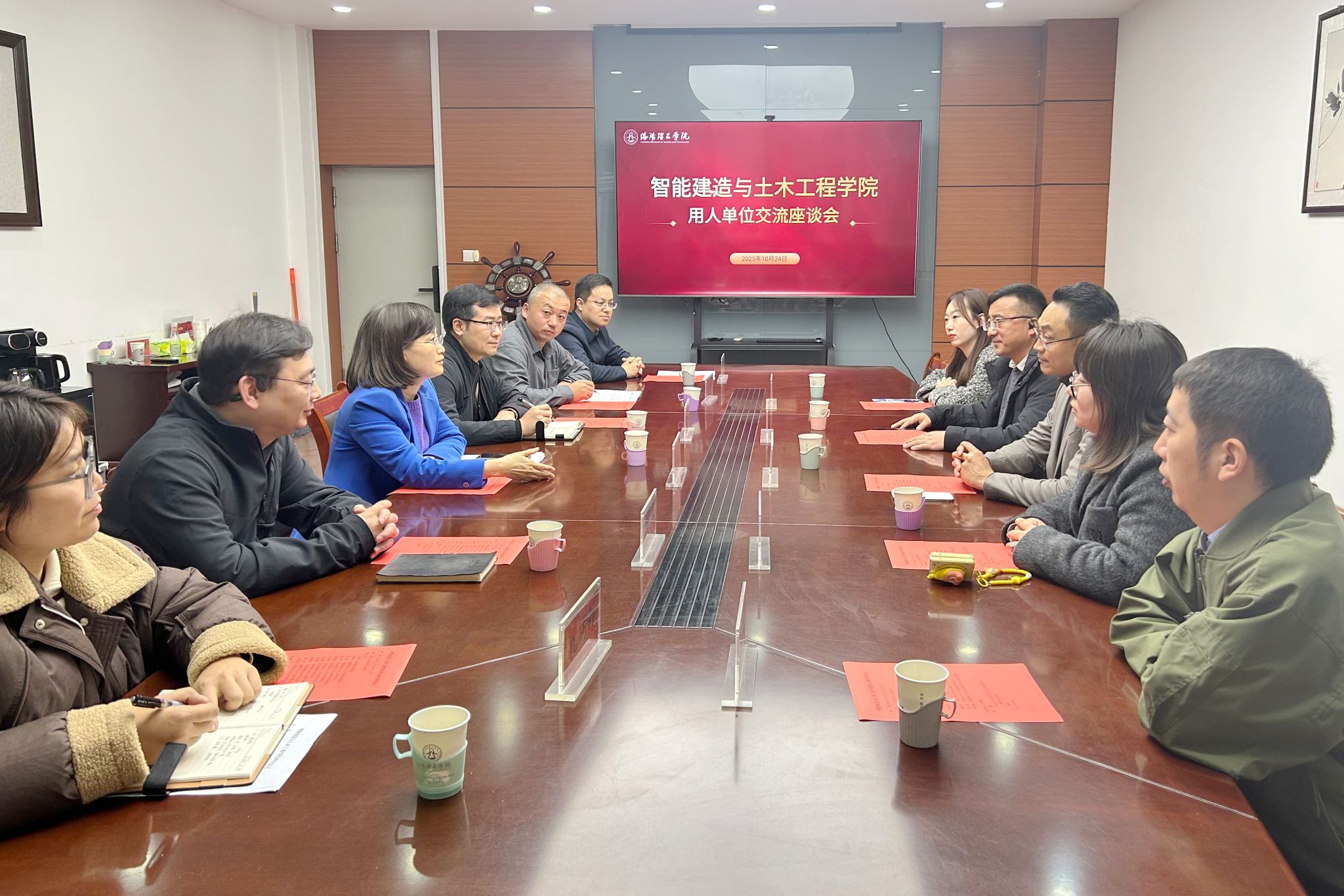 智能建造与土木工程学院负责人介绍学院概况及2026届毕业生情况。各用人单位代表分别介绍了企业发展概况和人才需求标准。与会人员围绕行业发展动态、推进人才培养、深化产教融合、加强就业供需合作等方面进行了深入交流。