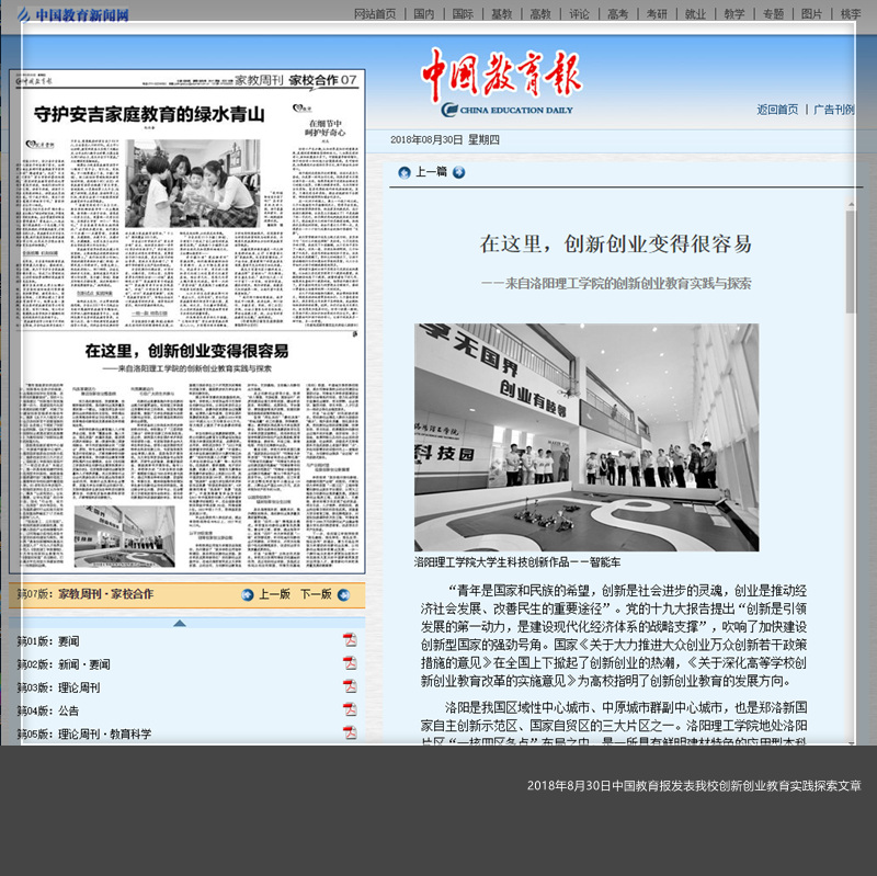2018年8月30日出版的中国教育报第07版以《在这里,创新创业变得很容易——来自乐鱼(中国)的创新创业教育实践与探索》为题对我校创新创业教育实践探索案例进行专题报道。