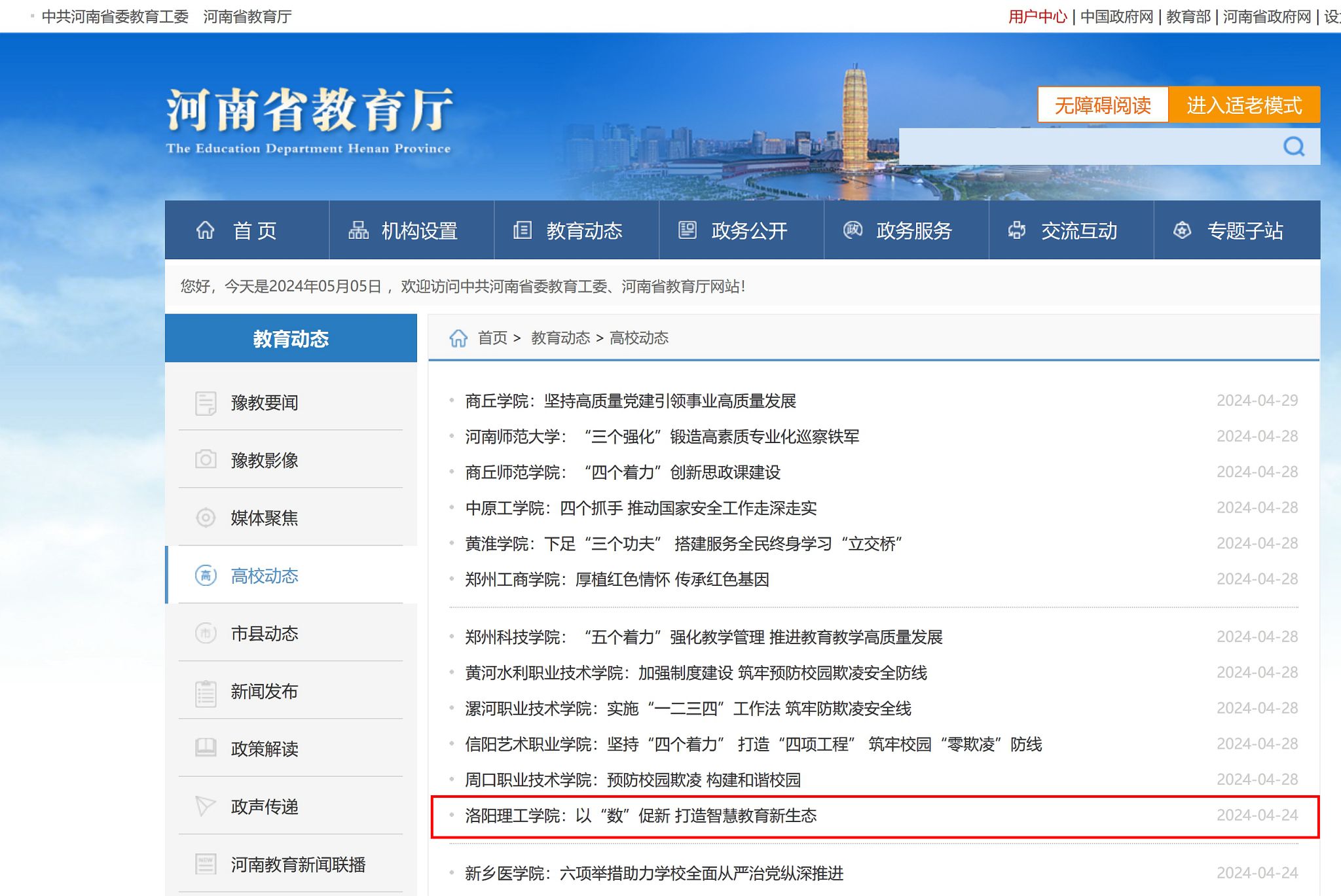 河南省教育厅官方网站报道版面