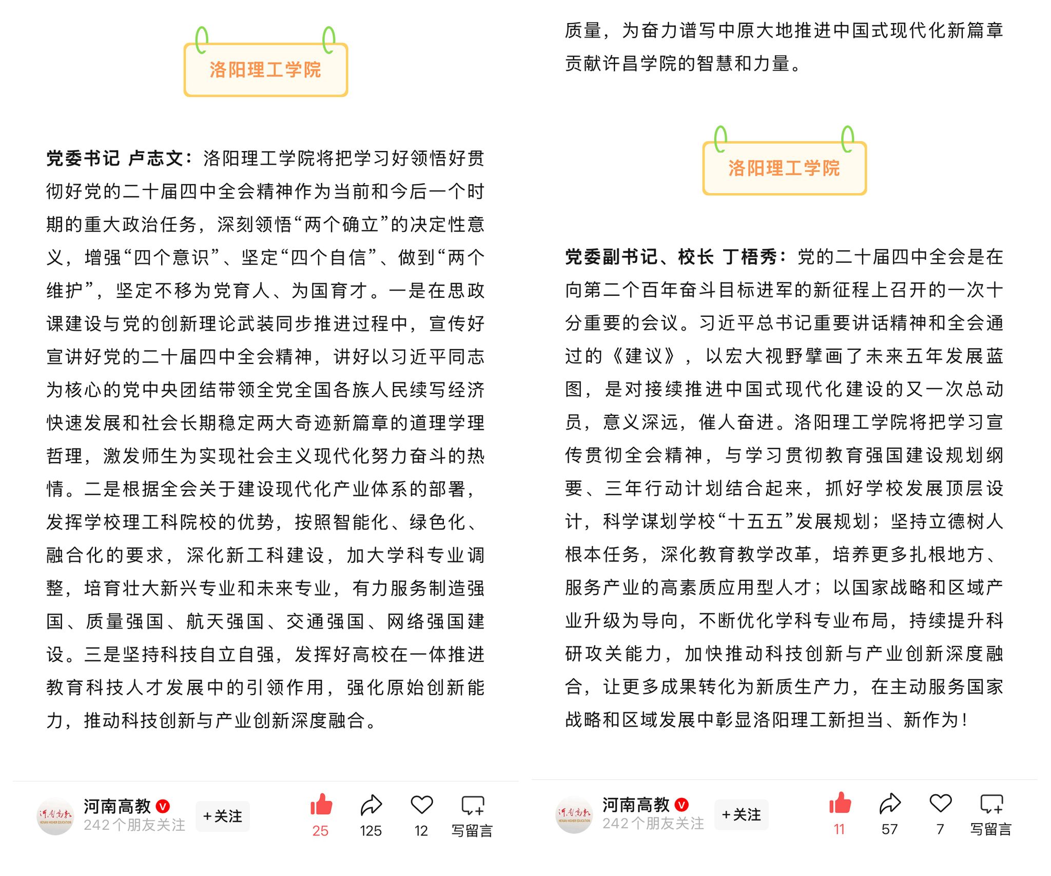 1.河南高教微信公众号,2025年10月24日,《擘画蓝图!河南本科高校书记校长热议党的二十届四中全会精神》