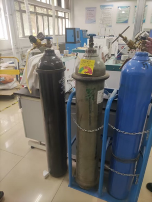 1. 材料科学与工程学院 ES113红外光谱室实验室(内间):两个气瓶未防护,存在倾倒伤人的安全隐患。