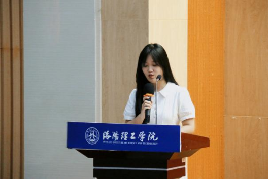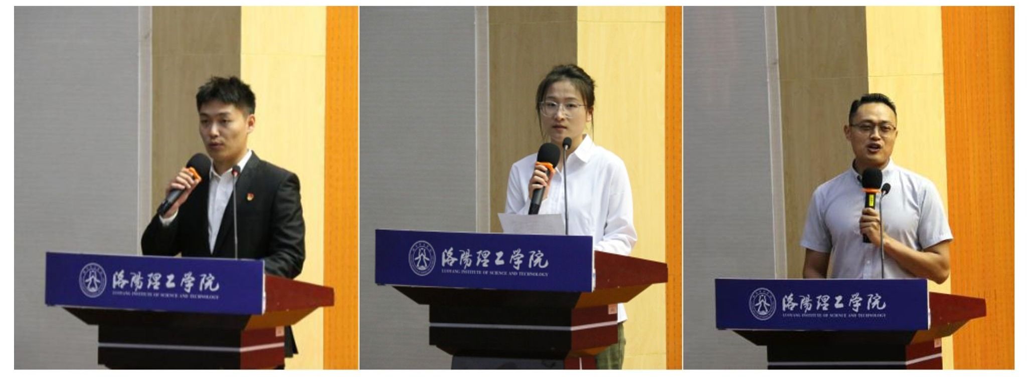 毕业生代表陆家豪(左)、在校生代表张鑫(中)、优秀校友代表、2012届校友、洛阳懿皇地产集团新媒体运营总经理(右)分别发言