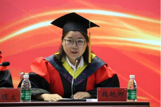 副院长魏艳卿(左)宣读我院2025届毕业生毕业情况、学位授予情况、优秀毕业设计情况以及考研情况