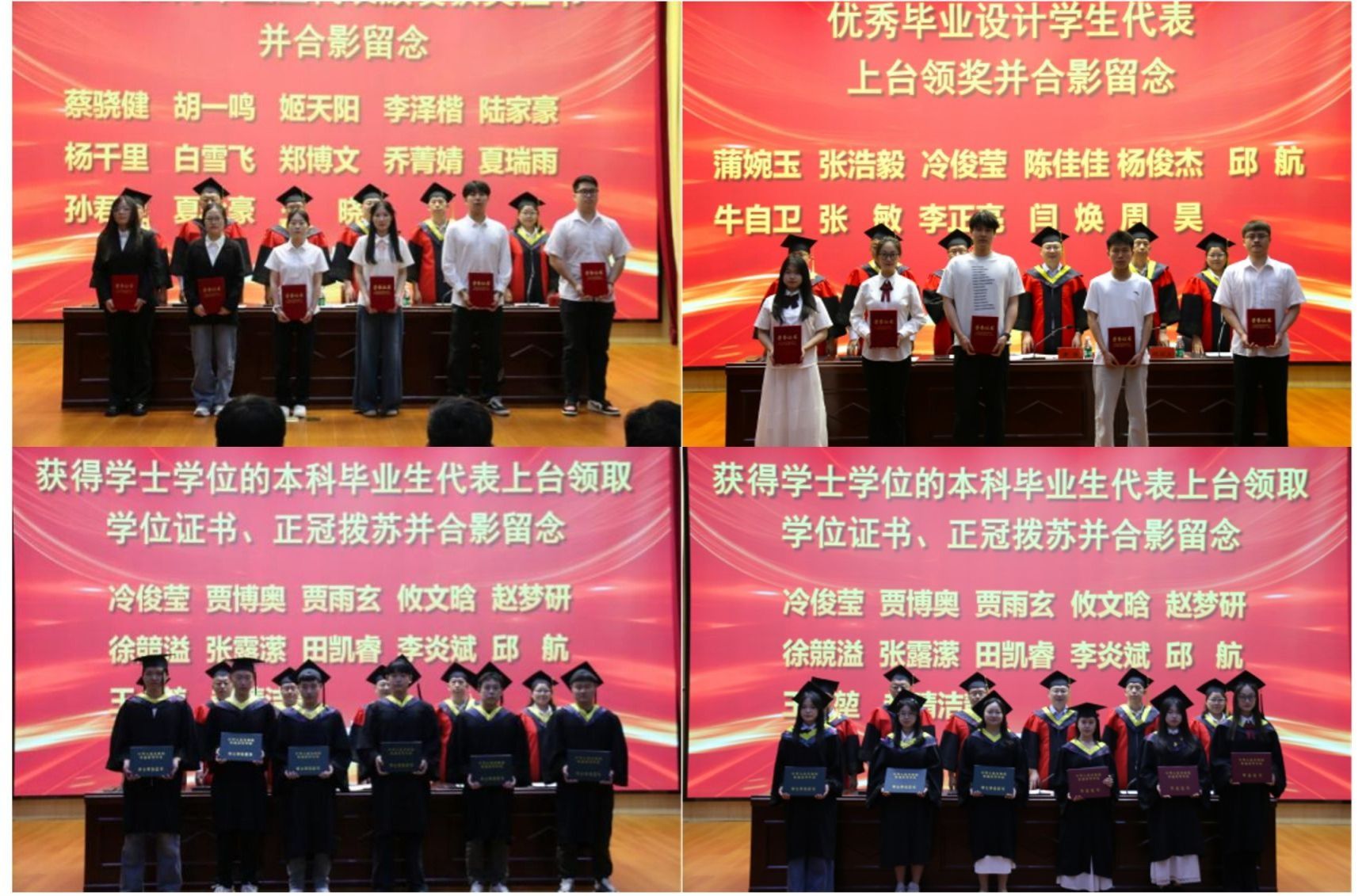 院领导分别为校优秀毕业生代表、优秀毕业设计学生代表颁发荣誉证书,为学士学位获得者代表正冠拨苏、授予学位,并合影留念。