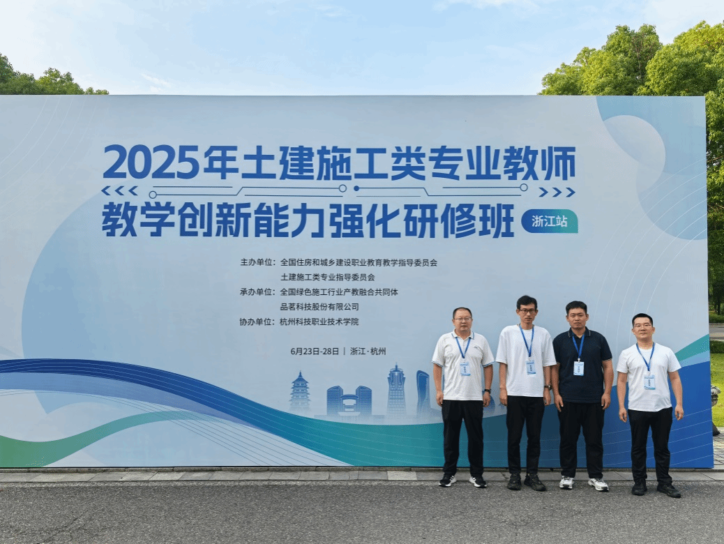 为贯彻《教育强国建设规划纲要(2024-2035年)》精神,积极落实国家关于智能建造、城市更新等建筑业发展新引擎的整体部署,搭建院校协同互动、创新发展的合作平台,提升师资队伍专业素质及交叉学科融合教学能力,有效推进院校土建类专业创新人才培养体系建设,6月23日至28日,由全国住房和城乡建设职业教育教学指导委员会、土建施工类专业指导委员会主办,全国绿色施工行业产教融合共同体、品茗科技股份有限公司协办的“2025年土建施工类专业教师教学创新能力强化研修班•浙江站”在杭州科技职业技术学院成功举办。我院委派智能建造专业相关核心课程负责教师参加此次研修活动。