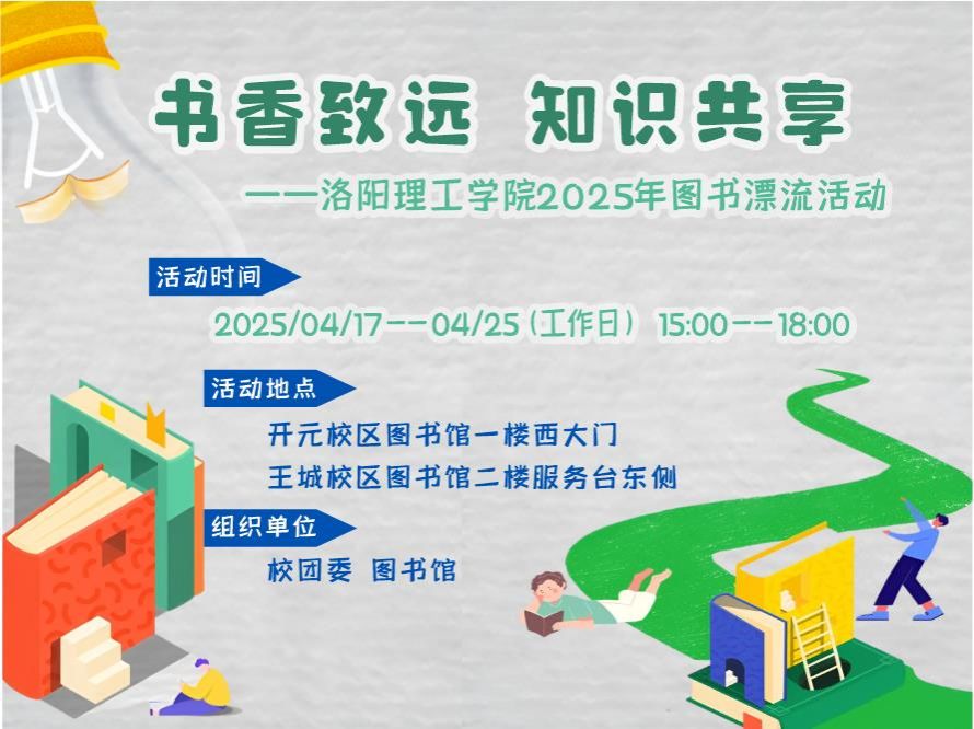 为充分发挥图书资料作用,践行绿色低碳环保理念,营造浓厚的校园阅读氛围,校团委、图书馆联合青年志愿者协会将往年考研、考级、考公学生留在图书馆的图书资料整理后,于4月17日起举办了为期一周的“书香致远 知识共享”图书漂流阅读推广活动。
