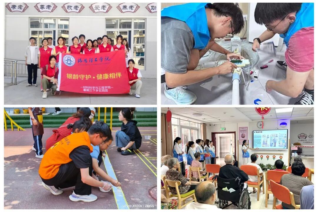 材料科学与工程学院“银龄守护,健康相伴”暑期社会实践团到洛阳市洛龙区花园爱心老年公寓开展敬老服务和反诈宣传。电力电气工程学院“红色螺丝刀”暑期社会实践团前往伊滨区下徐马村,开展家电维修、儿童陪伴和用电知识普及活动。艺术设计与服装学院“绘梦童行”团队在涧西区东升第三小学开展地绘艺术活动。外国语与国际传播学院“反诈零距离,关爱暖夕阳”暑期社会实践团在学府街道综合养老服务中心举办防诈骗讲座,帮助老人守护财产安全。同学们走进社区、乡村和养老机构,将专业所学转化为切实服务,在帮助老年群体、助力社区治理中弘扬了志愿精神,传递青年的温暖与关怀。
