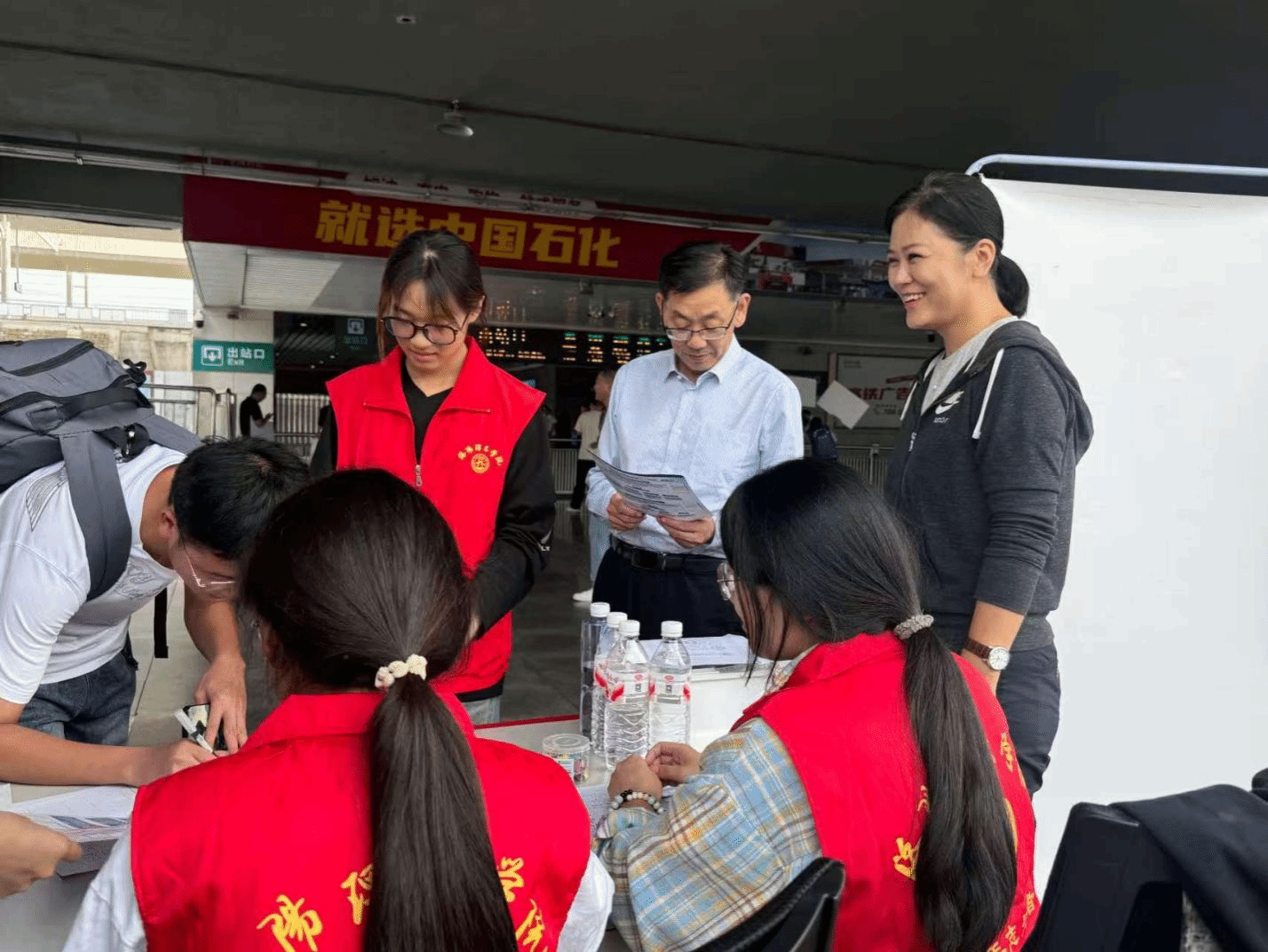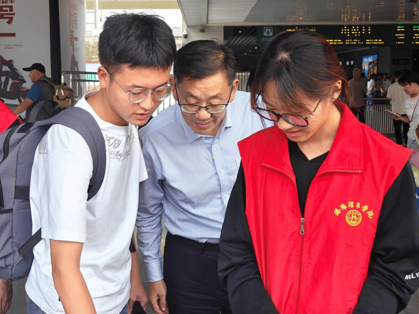 “刚下高铁还适应吗?行李多不多,要不要帮忙?”“对接下来的报到流程有任何不清楚的地方,可以随时找志愿者或者老师询问。”“对大学生活有什么期待吗?”迎新期间,校党委副书记胡恩立、校团委书记杜怡梅专程来到洛阳火车站和龙门高铁站迎新服务点,将学校的关怀与温暖送到迎新工作最前沿。