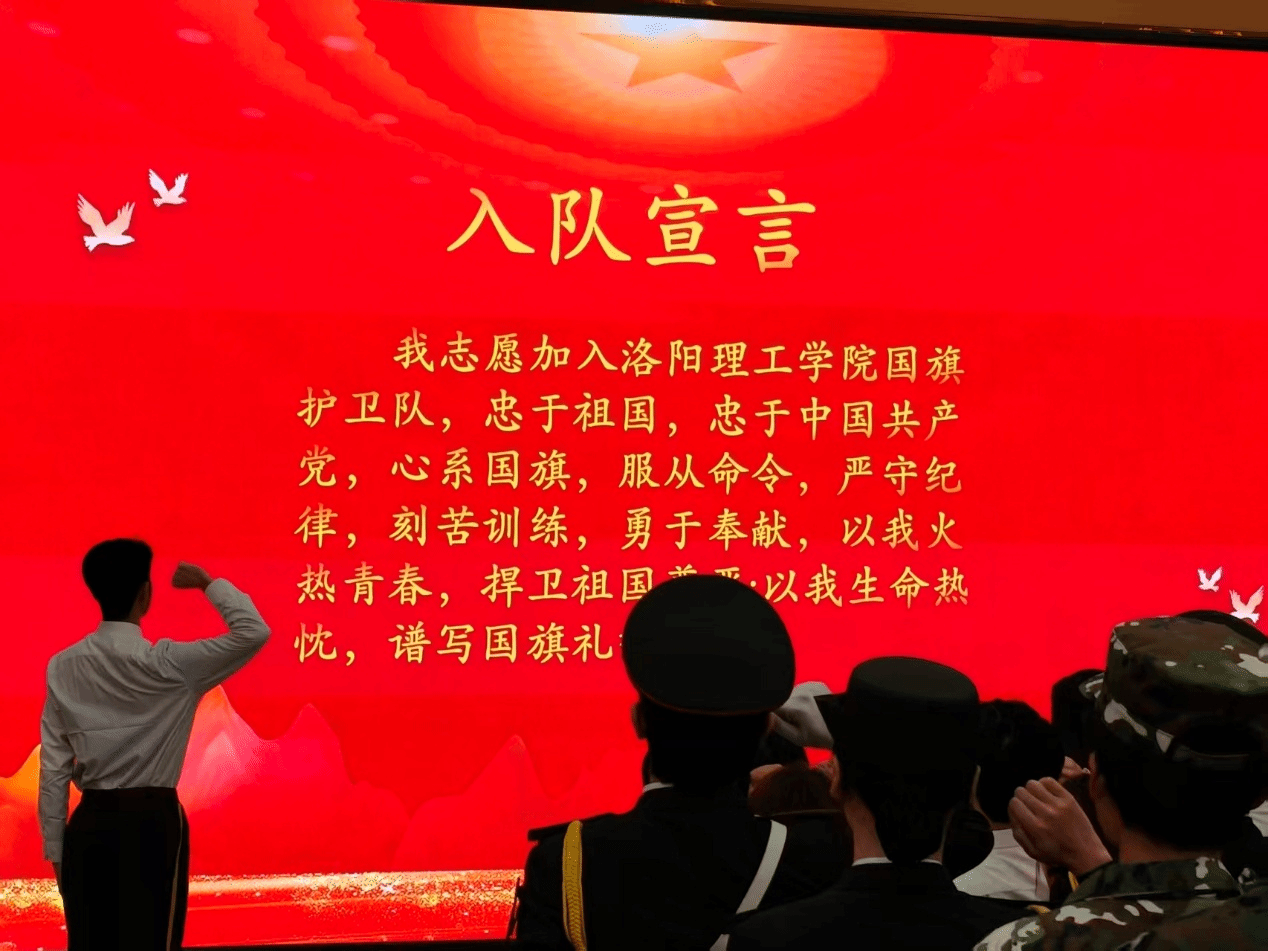 第十七届队员代表赵宇航回顾了从紧张执旗到深刻体悟“护旗先练心”的心路历程;随后,老队员为新队员佩戴臂章,一句“肩章扛着责任”,承载着信任与期许。第十八届队员代表赵佳慧分享了训练中的成长,坦言曾被老队员风雨无阻的坚守所打动,深刻理解了“护旗”二字的分量。第十八届总队长张世豪在发言中致敬前辈,承诺将以“抓训练、强作风、优服务”为核心,践行“护旗有我,使命必达”的誓言,并带领全体新队员庄严宣誓,誓言铿锵,彰显担当。