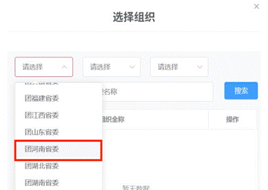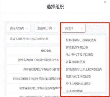 (4)“申请转入组织”一栏,利用下拉列表,选择“团河南省委”→“乐鱼(中国)团委”→“××学院团委”(新生团员入学后的所属学院)后,点击“搜索”,在列表中找到所需转入的团支部,点击“选择”。