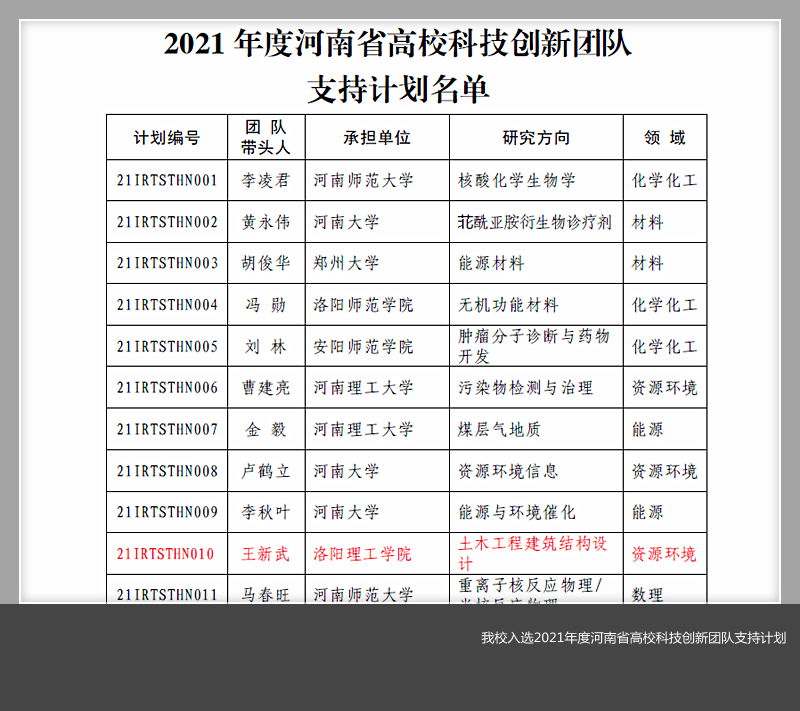 近日,河南省教育厅公布了2021年度河南省高校科技创新团队支持计划名单(教科技〔2020〕412号),我校王新武教授带领的“土木工程建筑结构设计”科研团队入选2021年度河南省高校科技创新团队支持计划。