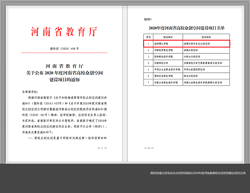 近日,河南省教育厅《关于公布2020年度河南省高校众创空间建设项目的通知》教科技〔2020〕498号,我校洛理文创专业化众创空间以第一名的成绩,获准立项建设。
