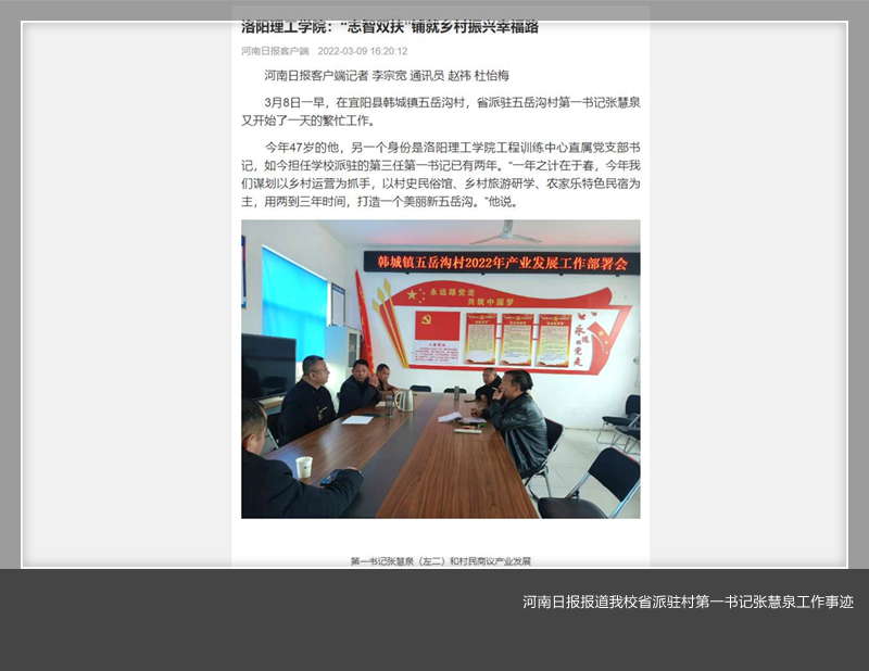 3月9日,河南日报客户端以《乐鱼(中国):“志智双扶”铺就乡村振兴幸福路》为题,报道我校省派驻村第一书记张慧泉驻村工作两年间,在巩固脱贫摘帽伟大胜利的基础上,实行扶贫和扶志扶智相结合,为五岳沟村提升农民整体内生动力和可持续发展贡献力量的工作事迹。