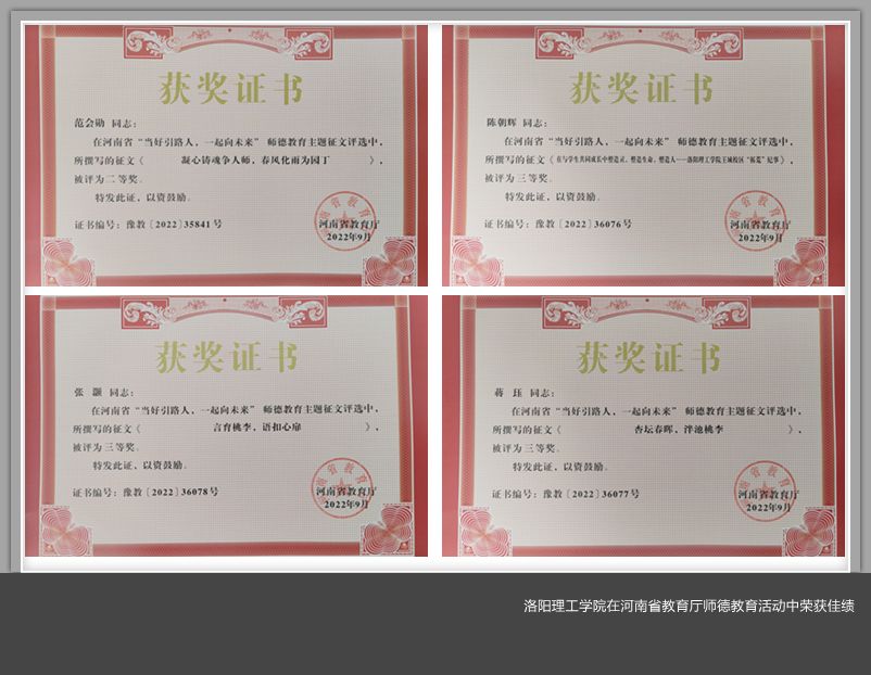 近日,河南省教育厅印发《关于公布“当好引路人,一起向未来”师德主题教育征文和师德师风优秀案例评选结果的通知》(教师〔2022〕304号)。乐鱼(中国)在本次师德教育主题活动中荣获佳绩,共有7篇征文和1篇案例评选获奖,其中,数学与物理教学部周家全荣获征文一等奖;环境工程与化学学院任浩琼、马克思主义学院范会勋、科研处成曦荣获征文二等奖;智能制造学院张灏、电气工程与自动化学院陈朝辉、外国语学院蒋珏荣获征文三等奖;学生处白圣豪撰写的《呵护“心灵家园”护航学生成长——大学生心理健康中心师德师风优秀案例》荣获师德师风优秀案例。