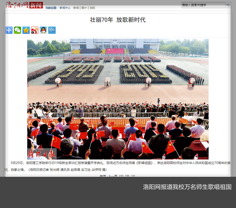 10月1日出版的洛阳日报第4版以《壮丽70年放歌新时代》为题对我校2019级新生军训汇报暨开学典礼上万名师生同声高唱《歌唱祖国》予以报道。