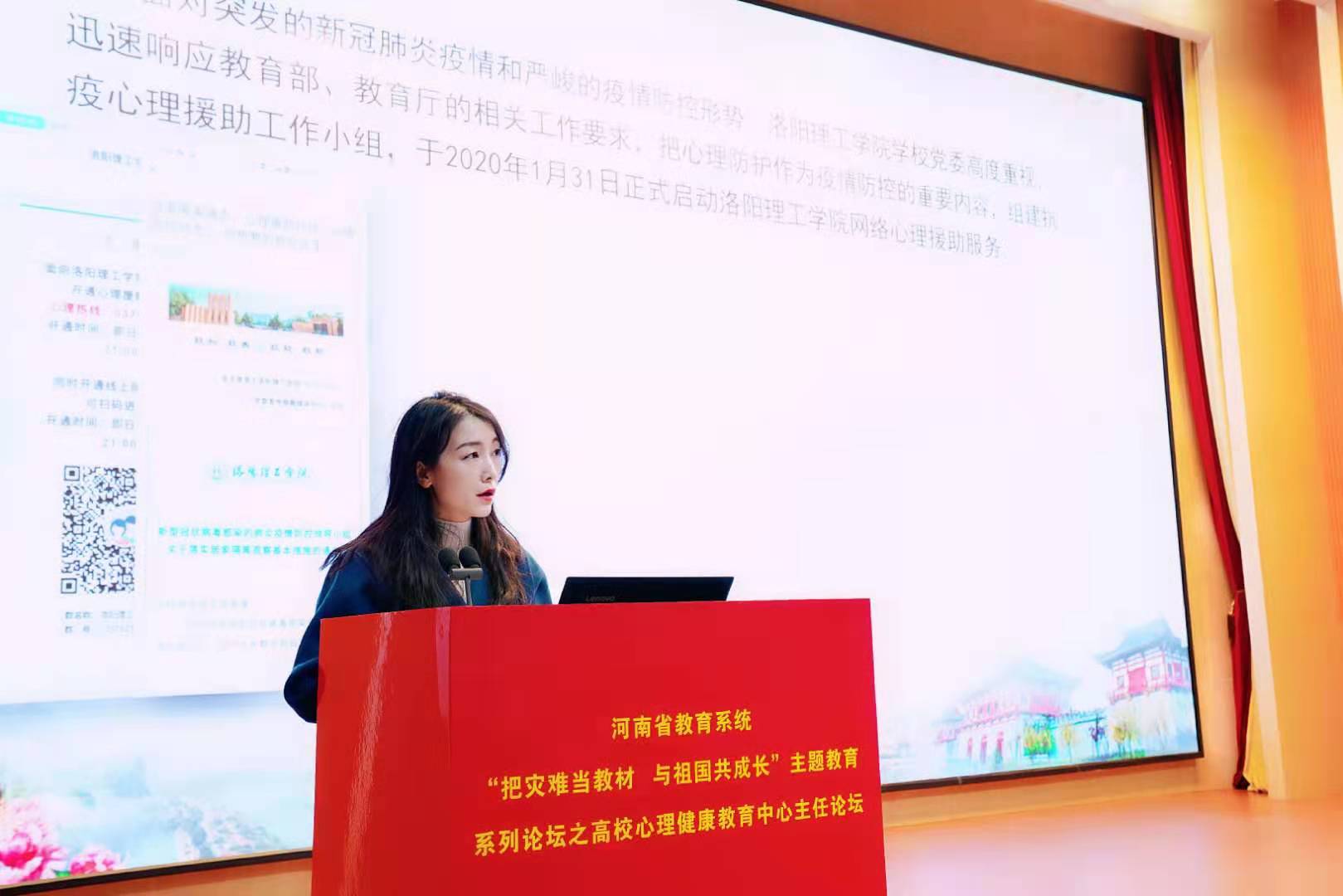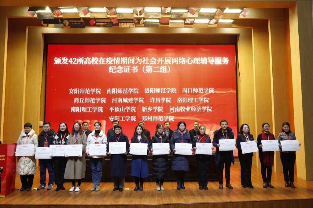 开幕式上,与会领导为疫情期间面向社会开展网络心理疏导服务的42所高校颁发纪念证书,我校位列其中。12月18日上午,我校大学生心理健康教育中心主任以“呵护心灵家园,筑牢安全屏障,护航学生成长”为题在会上作了典型发言。她全面总结了我校在疫情期间面向广大师生和社会公众开展网络心理援助服务的一系列有效举措:宣传引导、朋辈互助、协同联动、细致排查、精准帮扶等。以心润心,以心化心,在无时无刻的陪伴与支持中,用生命陪伴生命,用生命影响生命,用生命点亮生命,谱写了全体“洛理知心人”最温情的心灵乐章。