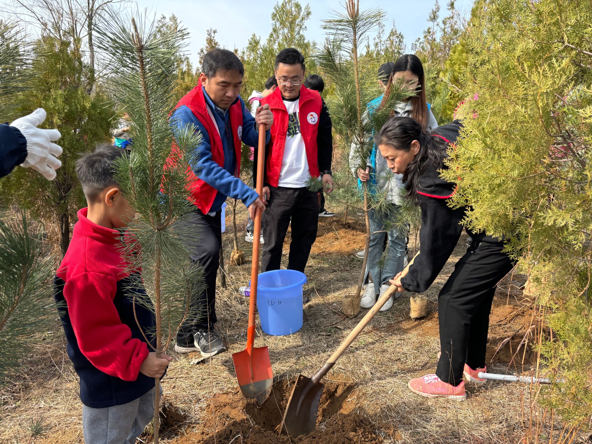 春风催新绿,植树正当时。植树现场鲜艳的党旗高高飘扬在植树划分点,党支部书记杜旻带领支部党员和郑州校友、同学们深入栽植一线,亲手将一棵棵树苗栽植入土。大家分工协作、相互配合、热情高涨。经过紧张劳作,一排排新栽种的树苗亭亭玉立,展现勃勃生机,为初春的中原大地增添丝丝活力。