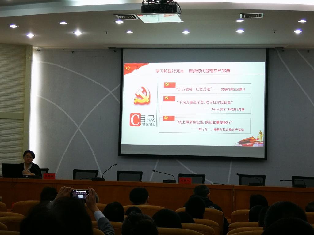 申艳红副教授报告会的题目是《学习和践行党章,做新时代合格共产党员》,内容有三个方面:一是党章的诞生及修订,二是为什么要学习和践行党章,三是知行合一,做新时代合格党员。报告会一开始,申教授就别开生面地从党章的历史演进切入,结合史实详细解读了中共党章的历史发展过程,并在此基础上解读了新党章的伟大创新。申教授的报告深入浅出、脉络清晰、重点突出、分析透彻、生动形象,既有理论上的深刻阐述,也有实践中的升华和提炼。国资处全体党员认真聆听并积极思考。申教授强调,党员干部特别是领导干部要自觉学习党章、遵守党章、贯彻党章、维护党章,要做学习党章、遵守党章的模范。