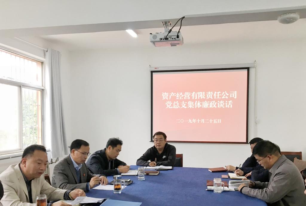 按照《资产经营有限责任公司2019年度党风廉政建设目标责任承诺书》的要求,10月25日上午,公司党总支书记李绍辉、总经理王群芳,与副总经理梁章辉、杨朝良以及各部门负责人进行集体廉政谈话。