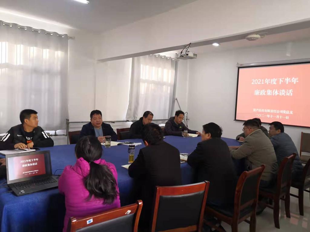 11月11日下午,公司党总支组织2021年度下半年廉政集体谈话。党总支书记李和平主持谈话会,总经理柴玉强、副总经理杨朝良、王浩,各科、室和部门负责人参加谈话会。