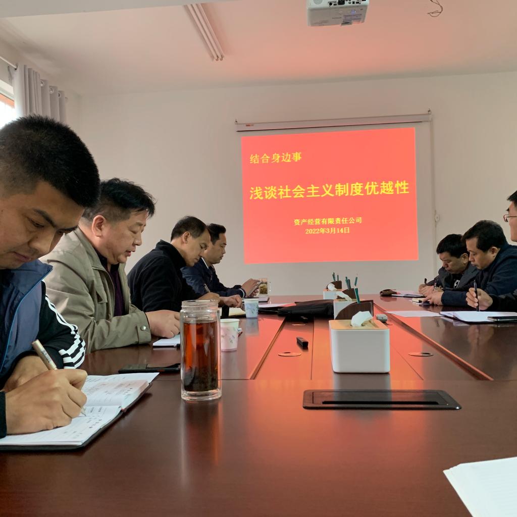 3月14日上午,公司党总支书记李和平在会议室为公司中心经理以上党员干部上了一堂“结合身边事--浅谈社会主义制度优越性”专题党课学习。
