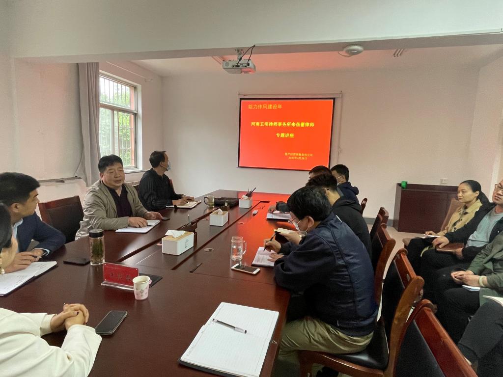 作为2022年“能力作风建设年”系列活动之一。为全面提升公司员工业务水平,增强全体员工的法律意识。公司在4月28日下午特邀请河南五明律师事务所来蓓蕾律师就“房屋合同签订法律依据及注意事项”有关内容进行了专题讲座。公司处级领导干部、各部门负责人、财务科、经营科、经营一部和二部全体业务骨干参加了培训。