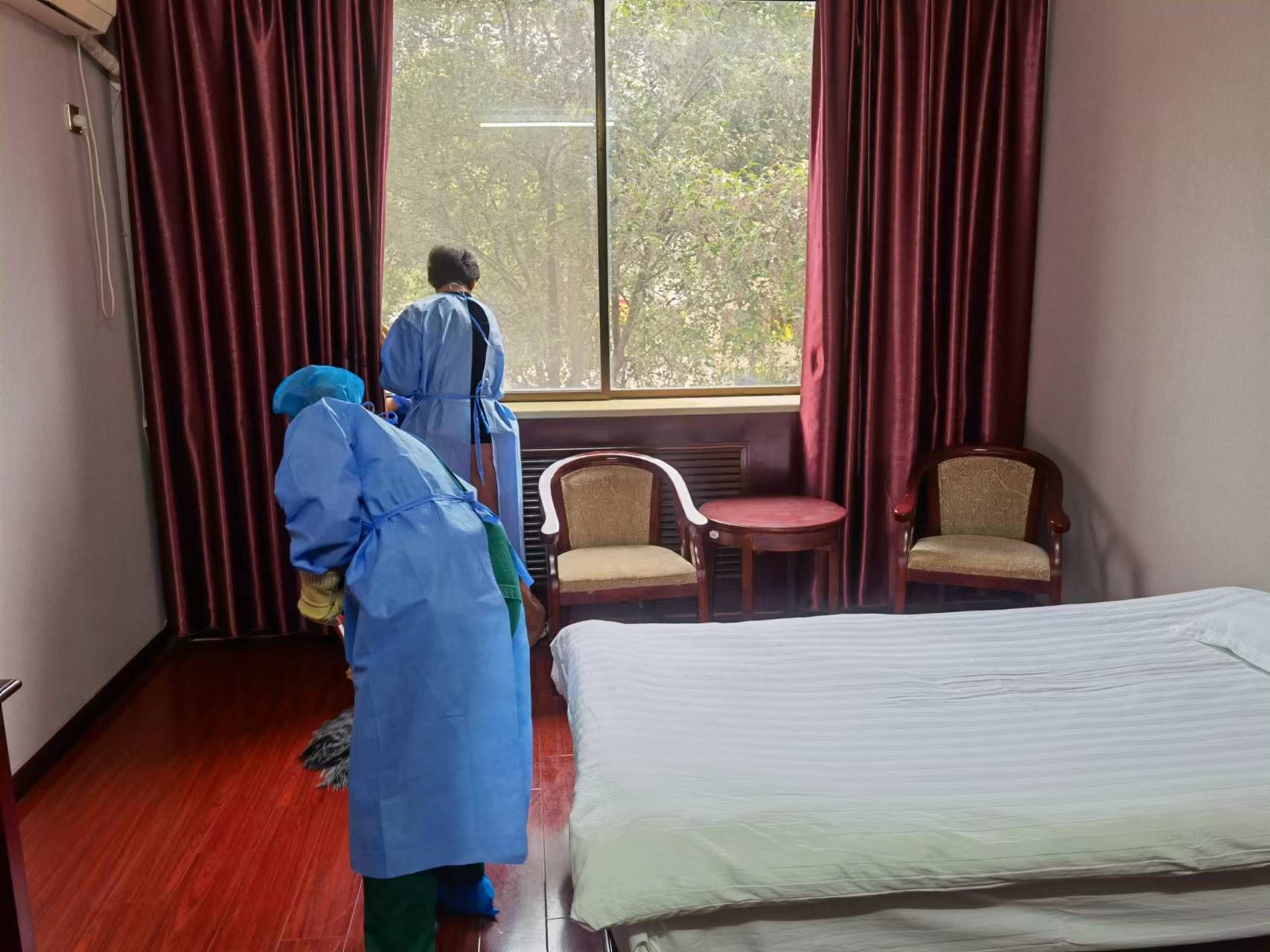 子衿宾馆做为学校疫情防控隔离区承担着隔离观察的重要工作任务。自学校实施封控管理以来,入住宾馆的学生人数骤增,工作量翻倍,但工作人员并没有增加。大家齐心协力,克服困难,顺利完成了客房、楼层及大厅环境卫生打扫,床上用品清洗消毒,隔离区每天消杀,为隔离学生送餐等工作任务。