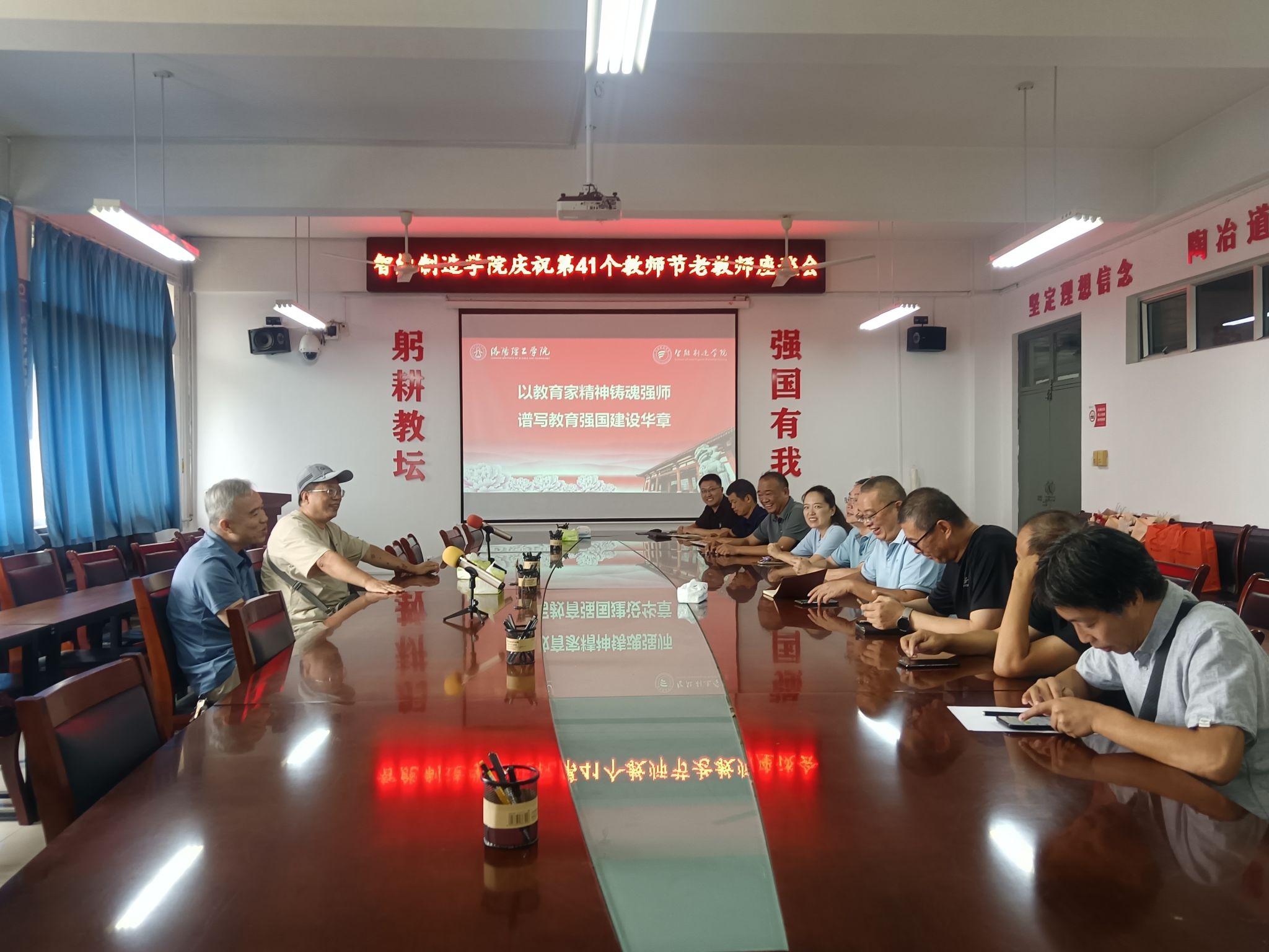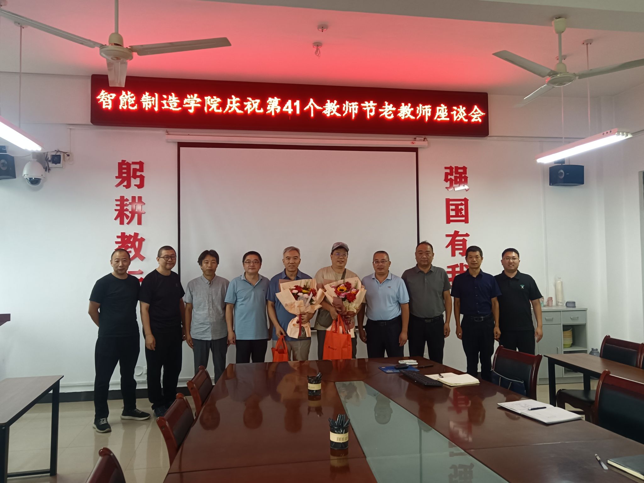 秋韵荡漾,桃李芬芳。在第41个教师节来临之际,为弘扬尊师重教优良传统,表达对全体教职工和退休教师的崇高敬意与诚挚关怀,智能制造学院2025年9月10日在学院会议室隆重举行教师节庆祝活动暨退休教师座谈会。学院党政领导班子成员、今年年退休教师代表、各系主任齐聚一堂,共叙育人情怀,共话学院发展。座谈会由学院党委书记贺艺主持。
