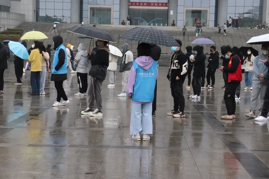 我院“智能蓝”志愿者冒雨在队伍中维持着秩序并提醒同学们扫描二维码、拿出身份证