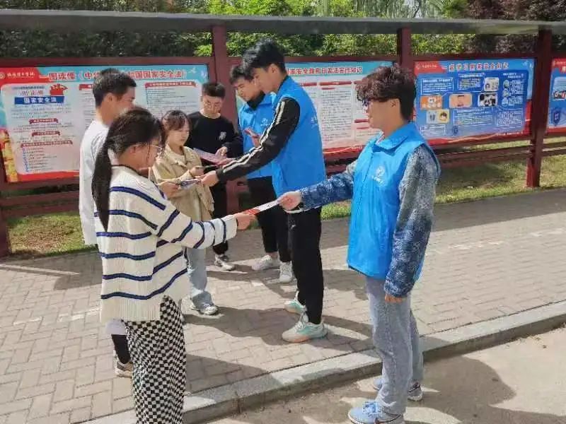 校园内开展立体宣传,公告栏内张贴着国家安全教育宣传海报、志愿者们也为路过的同学们发放宣传材料,该举措不仅营造了良好的国家安全宣传氛围,更增强了学生们对国家安全知识的了解。